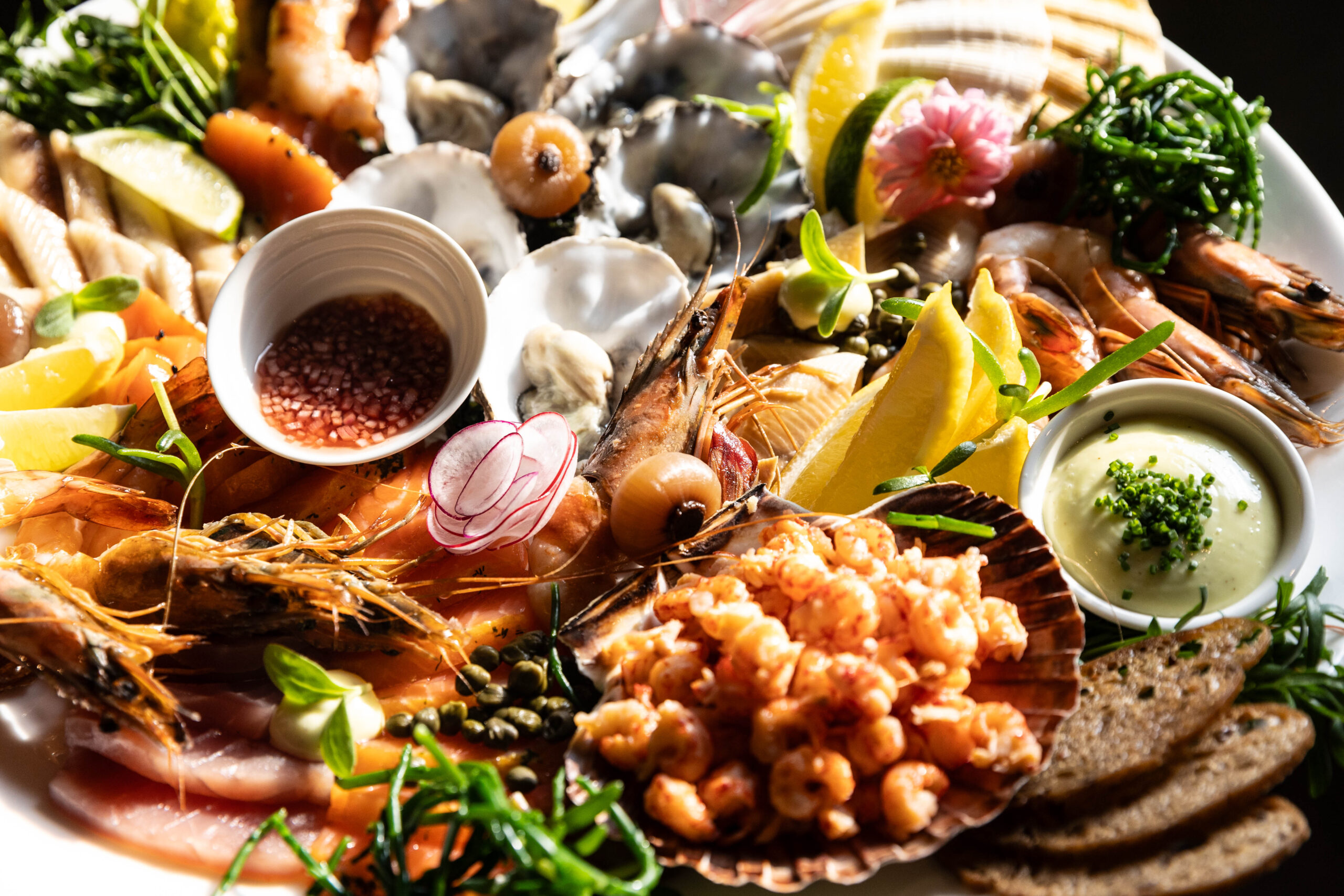 Onze fruits de mer wordt geserveerd met garnituur, inclusief knapperige crostini’s, diverse sauzen en vers zuurdesembrood.